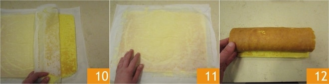 Nivelad la superficie con una espátula pequeña 7 y hornead en horno estático precalentado a 220°C durante unos 8-10 minutos: la superficie debe quedar dorada 8. Podéis hacer la prueba del palillo antes de sacar del horno, recordad que cada horno es un mundo aparte, para el vuestro podría ser necesario más tiempo o una temperatura ligeramente más baja. Mientras tanto, preparad una hoja de papel de horno y colocadla sobre el mostrador. Tan pronto como saquéis la pasta biscuit del horno tendréis que volcarla sobre la hoja de papel de horno limpia 9.
