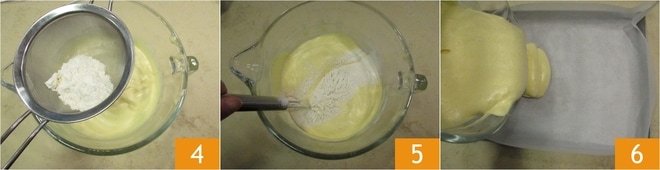 Añadid la harina tamizándola directamente en el bol 4 y mezclad delicadamente con una espátula de abajo hacia arriba para incorporarla, sin prisa y con movimientos ligeros 5. Engrasad y cubrid con papel de horno una bandeja de 30x40 cm. Verted la masa en la bandeja 6.