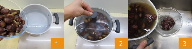 Para preparar la pasta con boletus, salchicha y castañas desmenuzadas, primero poned las castañas en una cacerola llena de agua 1, luego cubrid con una tapa 2 y dejad cocer durante 30 minutos. Una vez transcurrido este tiempo, haced la prueba del palillo: pinzadlas para verificar que estén cocidas y en ese caso escurridlas 3.
