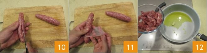 Pasad ahora a la salchicha: realizad un corte a lo largo, incidiendo delicadamente la parte exterior 10. Retirad la tripa 11 y desmenuzadla groseramente. Luego verted el aceite en una cacerola, añadid el ajo y dejad que se dore. Una vez bien dorado, añadid la salchicha 12 y dejadla dorar a fuego alto.