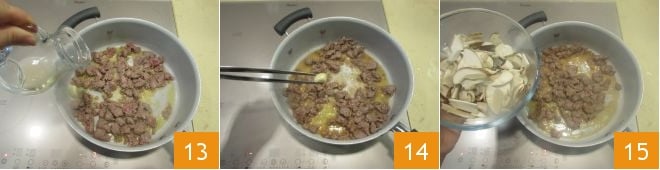 Desglasad con el vino blanco 13, eliminad el ajo 14 y dejad cocer durante otros 10 minutos. Añadid las setas previamente cortadas 15, añadid una pizca de sal y pimienta.