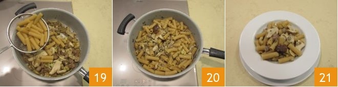 Escurrid la pasta muy al dente y vertedla directamente en la cacerola 19, mezclad todo y dejad saborizar durante un par de minutos 20; luego emplatad y servid vuestra pasta, boletus, salchicha y castañas desmenuzadas 21.