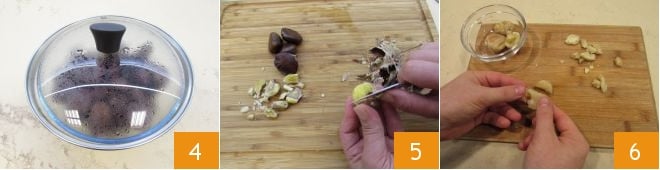 Reservadlas en un bol, cubiertas 4: de este modo, gracias al vapor, la cáscara exterior se ablandará y podréis pelarlas más fácilmente. Una vez frías, pelad las castañas 5, debéis obtener 150 gr de castañas limpias, y con las manos desmenuzad algunas 6, reservando las otras enteras.