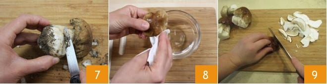 A este punto, ocupáos de la limpieza de las setas boletus: ayudándoos con un cuchillo pequeño, eliminad la parte final del tallo de la seta 7 y limpiad la parte superior con un paño húmedo. Si hay mucha tierra, podéis enjuagarla rápidamente bajo el agua corriente y secarla con papel de cocina 8. Una vez limpias todas las setas, cortadlas en láminas finas 9.