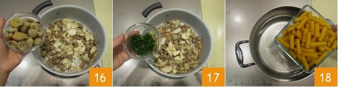 Esperad 3-4 minutos, mezclando de vez en cuando, y añadid también las castañas 16. Añadid el perejil picado 17 y coced la pasta en abundante agua hirviendo, salada al gusto 18.
