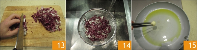 Pica finamente la achicoria 13 y enjuágala bajo agua corriente 14, luego escúrrela bien. En este punto, pasa a la estufa y deja que un diente de ajo se dore en 20 gramos de aceite de oliva 15.