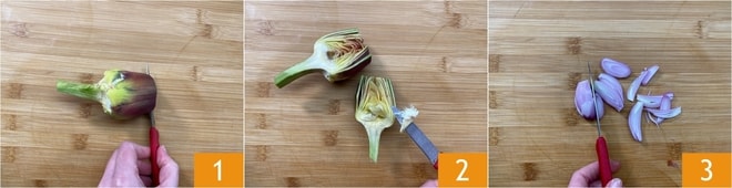 Para preparar la pasta con alcachofas lo primero que hay que hacer es limpiar las alcachofas. Eliminad las hojas externas más duras, recortad y limpiad el tallo y la base, cortando las puntas 1. Luego, dividid la alcachofa por la mitad y eliminad la pelusa interna 2. Ahora cortad las alcachofas en rodajas finas. Pasad al chalote: peladlo, cortadlo en rodajas 3 y picadlo finamente.