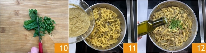 Coced la pasta al dente y mientras tanto cortad las hojas de menta en tiras 10, teniendo cuidado de no cortarlas demasiado con el cuchillo. Escurrid la pasta y transferidla a la cacerola con las alcachofas. Añadid la crema 11 y ajustad la consistencia con agua de cocción de la pasta, cocinándola durante un par de minutos para que se mezcle con el condimento. Completad con un chorro de aceite 12, la menta y un poco de pimienta negra recién molida. ¡Saltead y emplatad!