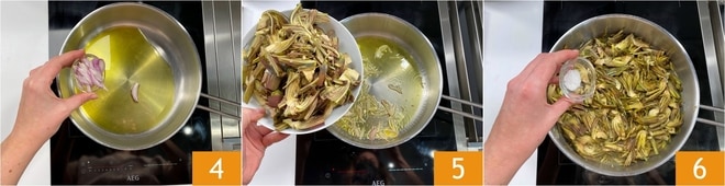 Sofreíd el chalote en una cacerola grande con un buen chorro de aceite. Cuando el chalote esté bien dorado, añadid las alcachofas 5. Dejad que se doren un minuto y luego añadid agua (unos 50 g) y sal 6.