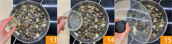 Mantén la llama alta y rocía primero con el vino blanco 13 y luego con el zumo de limón 14. Cubre con la tapa 15 y espera a que se abran.