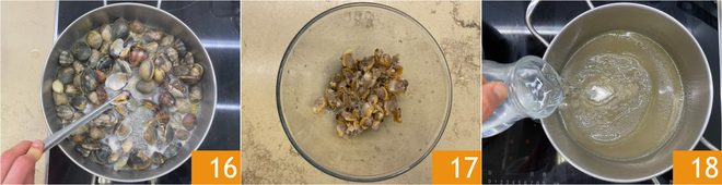 Cuando las almejas se hayan abierto 16, apaga el fuego y separa los moluscos de las conchas, reservando algunas enteras para la presentación 17. Filtra el líquido de cocción en una olla y añade unos 100 g de agua 18.