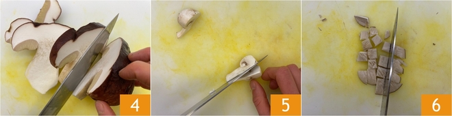 Limpia también los hongos: corta los porcini primero en rodajas 4 y luego en dados del mismo tamaño que la calabaza. Corta en trozos también los champiñones 5 y los pleurotus 6.