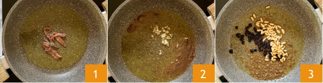 Para preparar la pasta c'anciova, empezad vertiendo las anchoas en una sartén con el aceite 1 y mezclad a menudo para que no se disuelvan completamente. Posteriormente, añadid primero el ajo finamente picado 2 y luego los piñones y las pasas 3, dejad sazonar durante un par de minutos.