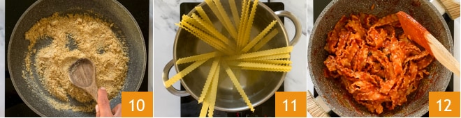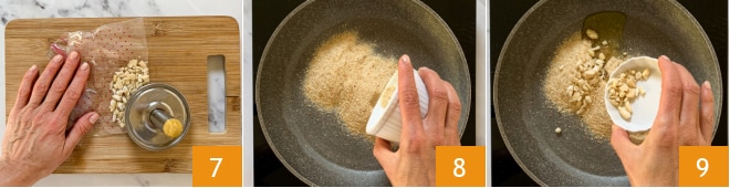 Mientras tanto, poned la olla con agua en el fuego para la pasta y ocupaos también de la "muddica atturrata" (es decir, el pan rallado tostado). Poned las almendras en una bolsa y trituradlas groseramente con un mazo o un peso 7. Verted el pan rallado en una sartén antiadherente 8 y añadid las almendras trituradas 9.