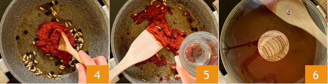 En este punto, añadid el concentrado de tomate 4 y el agua 5. Añadid sal, pimienta y una pizca de azúcar, poned la tapa y dejad cocinar durante 10 minutos a fuego lento 6.