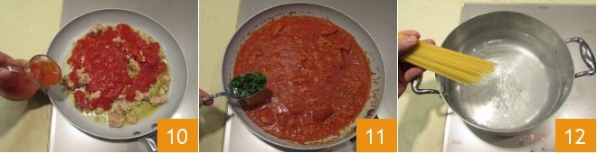 y el puré de tomate 10. Cocinad a fuego moderado durante unos 15 minutos, luego perfumad con el perejil picado 11. Mientras tanto, llevad a ebullición una olla llena de agua con sal y coced las bavette durante el tiempo indicado en el paquete 12.