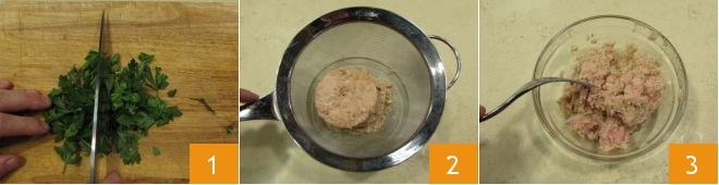 Para realizar la pasta con atún, anchoas y huevas de pescado, empezad lavando y picando el perejil fresco 1, luego tomad el atún, escurridlo con un colador para eliminar el aceite en exceso 2, después pasadlo a un bol y desmenuzadlo con el tenedor 3.