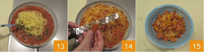 Escurrid la pasta y echadla directamente en la sartén con la salsa 13, como toque final sazonad con una pizca de huevas de pescado ralladas 14, haced saltear la pasta por unos instantes en la sartén. Servid la pasta con atún, anchoas y huevas de pescado bien caliente 15.