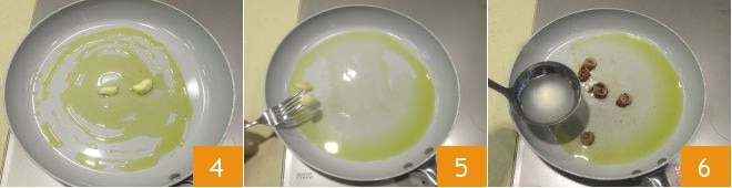 En una sartén amplia calentad un chorrito de aceite de oliva con el ajo 4, cuando el aceite esté aromatizado, eliminad los dientes de ajo 5, añadid los filetes de anchoa y verted un cucharón de caldo (o agua caliente)6.