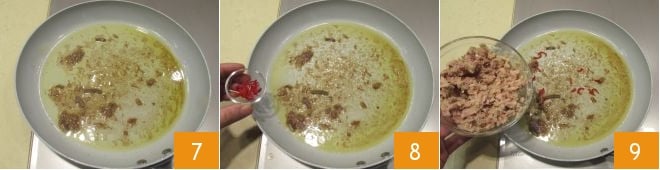 Dejad que las anchoas se disuelvan para crear una base sabrosa 7, ahora aromatizad con el chile fresco cortado en tiras 8. Añadid también el atún 9