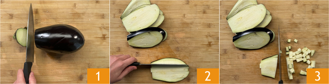 Para preparar la pasta con berenjenas, lo primero que debes hacer es ocuparte de las berenjenas: lávalas, quítales los extremos y córtalas primero en rodajas 1, luego en bastones 2 y finalmente en cubos de aproximadamente 1 cm 3.