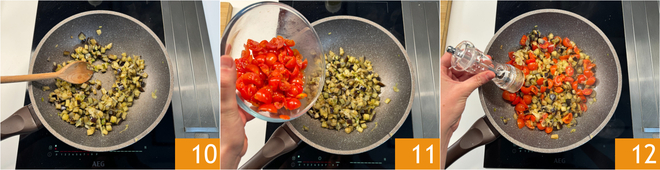 Cuando las berenjenas estén tiernas y cocidas 10, añade los tomatitos 11. Ajusta de sal 12 y de pimienta y deja cocinar durante otros 4-5 minutos.