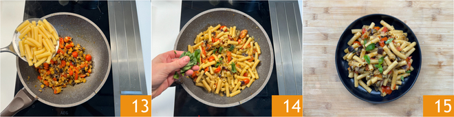 Cuando la pasta esté al dente, escúrrela 12 y transfiérela directamente a la cacerola con las berenjenas 13. Saltea todo durante unos minutos agregando un poco de agua de cocción para mezclar bien, luego adorna con las hojas de albahaca 14. ¡Solo te queda emplatar tu pasta con berenjenas 15!