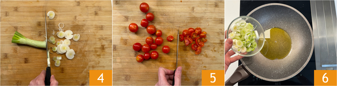 Limpia y corta el cebolleta primero por la mitad y luego en rodajas finas 4. Lava y corta en cuartos los tomatitos 5. Calienta el aceite en una cacerola, luego añade la cebolleta 6.