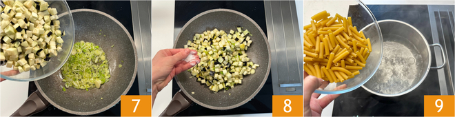Una vez esté bien pochado, añade las berenjenas 7, sal 8, pimienta y deja cocinar durante unos 15 minutos. Mientras tanto, cuece la pasta al dente en agua hirviendo con sal 9.