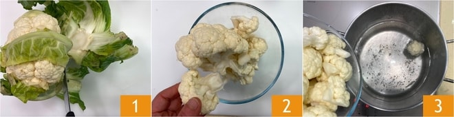 Para realizar la pasta con brócoli arriminati primero limpia la coliflor eliminando la base y las hojas 1, luego separa las florecillas 2. Lleva a ebullición una olla de agua con sal y hierve las florecillas de coliflor durante 8-10 minutos 3.
