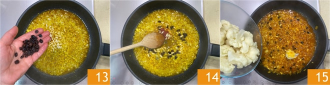 Añade las pasas, bien escurridas 13, y mezcla todo 14, luego agrega también la coliflor 15.