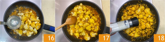 Vierte un cucharón del agua de cocción 16 y cocina durante unos 20 minutos a fuego medio-bajo, rompiendo las florecillas con el cucharón para obtener una especie de ragú 17. Ajusta de sal y pimienta 18.