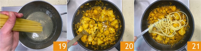 Mientras tanto, lleva nuevamente a ebullición el agua de cocción de la coliflor y cocina los bucatini 19. Transcurrido el tiempo de cocción del condimento, retira una parte para el emplatado 20. Escurre la pasta muy al dente y transfiérela a la sartén 21.