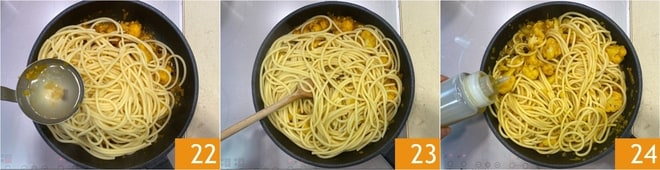 Añade un poco de agua de cocción 22 y termina de cocinar los bucatini junto con el condimento 23. Finalmente, mezcla con un hilo de aceite 24 y saltea todo.