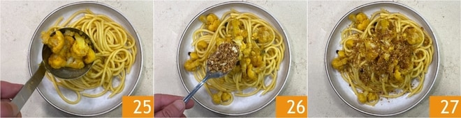 Completa los platos con el condimento reservado 25 y un puñado de pan rallado tostado 26. ¡Tu pasta con brócoli arriminati está lista para ser servida 27!