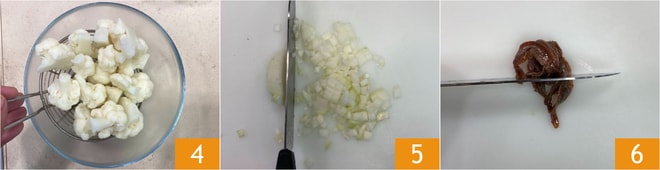 Escurre la coliflor y reserva el agua de cocción 4. Mientras tanto, pon en remojo las pasas y disuelve el azafrán en poca agua caliente. Pica la cebolla 5 y los filetes de anchoa 6.