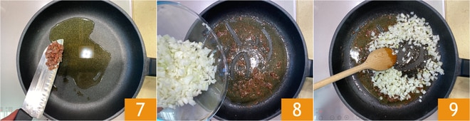 Calienta un poco de aceite en una sartén grande, luego agrega las anchoas 7 y la cebolla 8. Remueve a fuego lento para deshacer las anchoas 9.