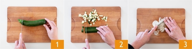Para preparar la pasta con calabacines y jamón lo primero que debes hacer es ocuparte de los calabacines. Después de lavarlos, retira los extremos 1 y córtalos en cubitos 2. Pica finamente también la cebolla 3.