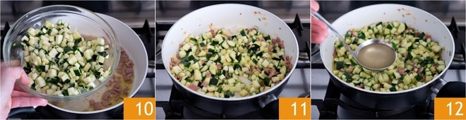 Agrega los calabacines 10 y déjalos sazonar unos minutos, luego añade sal y continúa la cocción 11. Cuando los calabacines comiencen a secarse, añade un cazo de caldo 12.