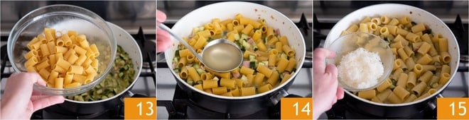 Continúa la cocción hasta que los calabacines estén tiernos, tomará otros 10 minutos. Agrega la pasta 10 y cocínala como si fuera un risotto, añadiendo un cazo de caldo cuando sea necesario 14: en esta técnica los tiempos de cocción se alargan en comparación con los indicados en el paquete. Cuando la pasta esté cocida, apaga el fuego y añade el Grana rallado 15.