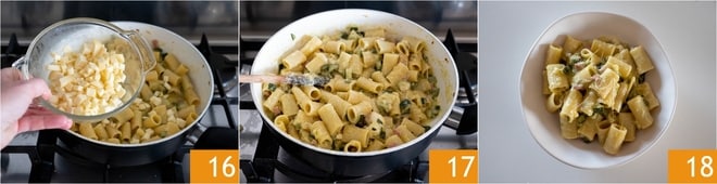Añade el queso provola en cubos 16 y mezcla hasta que esté completamente derretido. Añade un chorrito de aceite en crudo y sírvela 18.