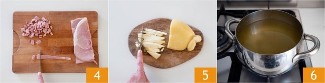 Corta el jamón cocido en cubitos 4 y también el queso scamorza 5. Pon a calentar el caldo vegetal 6.