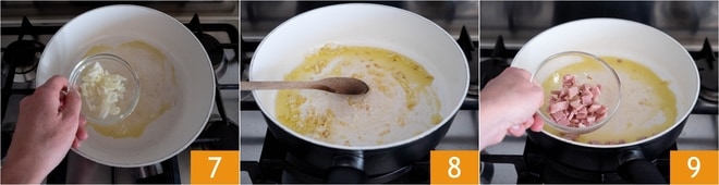 Vierte en una sartén grande, de bordes altos, un chorrito de aceite y la cebolla 7, déjala pochar 8, luego añade también el jamón cocido y déjalo dorar durante un par de minutos 9.