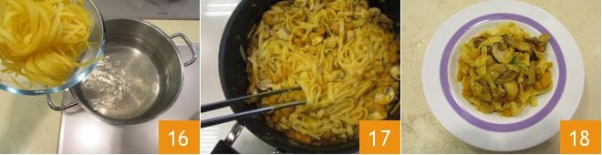 Cuece la pasta 16, escúrrela al dente y viértela directamente en la sartén con el condimento con el fuego apagado. Remueve delicadamente 17 y sirve inmediatamente tu pasta con calabaza y champiñones 18.
