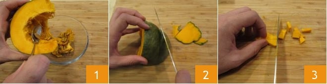 Para preparar la pasta con calabaza y champiñones, empieza limpiando la calabaza. Córtala, quita las semillas internas 1 y la cáscara 2; deberás obtener 460 g de calabaza limpia. Luego reduce la pulpa en rodajas y posteriormente en cubos de aproximadamente medio cm 3.