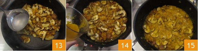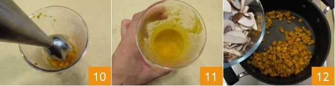 y tritura todo con una batidora de inmersión 10 hasta obtener una crema 11. Mientras tanto, tras los 10 minutos de cocción de la calabaza restante, añade también los champiñones en la cacerola 12 y cocina durante al menos 5 minutos más a fuego medio. Remueve de vez en cuando.