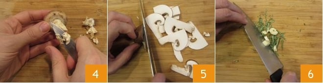 Limpia también los champiñones crema (puedes ver el procedimiento completo en la ficha de nuestro sitio "cómo limpiar los hongos"), eliminando la parte más terrosa del tallo 4 y limpiando con un paño ligeramente humedecido tanto el sombrero como el tallo (también puedes enjuagarlos muy rápidamente bajo un chorro débil de agua fría y secarlos rápidamente para que no absorban agua). Luego corta los champiñones en rodajas finas 5, pica también los dientes de ajo limpios y el romero 6.