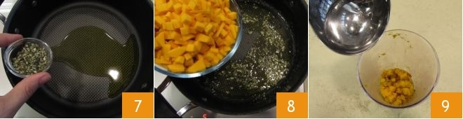 En una cacerola, vierte abundante agua y al hervir añade sal: servirá para la cocción de la pasta. Mientras el agua se calienta, en otra cacerola, vierte el aceite y sofríe el picado de ajo y romero 7. Remueve unos instantes, luego añade la calabaza cortada en cubos 8 y cocina durante unos 10 minutos a fuego medio, removiendo a menudo. Cuando la calabaza se haya ablandado (bastarán 5 minutos), retira una parte y prosigue la cocción de la calabaza restante en la sartén. Vierte la calabaza retirada en un vaso alto, añade un poco de agua de cocción de la pasta 9