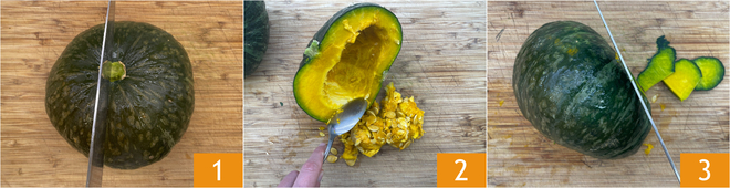 Para preparar la pasta con calabaza y gorgonzola, lo primero que hay que hacer es coger la calabaza, abrirla por la mitad 1 y quitar todas las semillas con la ayuda de una cuchara 2. Luego quitad la piel 3.