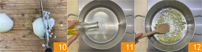 Pela y pica una cebolla muy finamente 10. En una cazuela bastante grande, vierte abundante aceite 11 y la cebolla. Sofríe a fuego moderado 12.